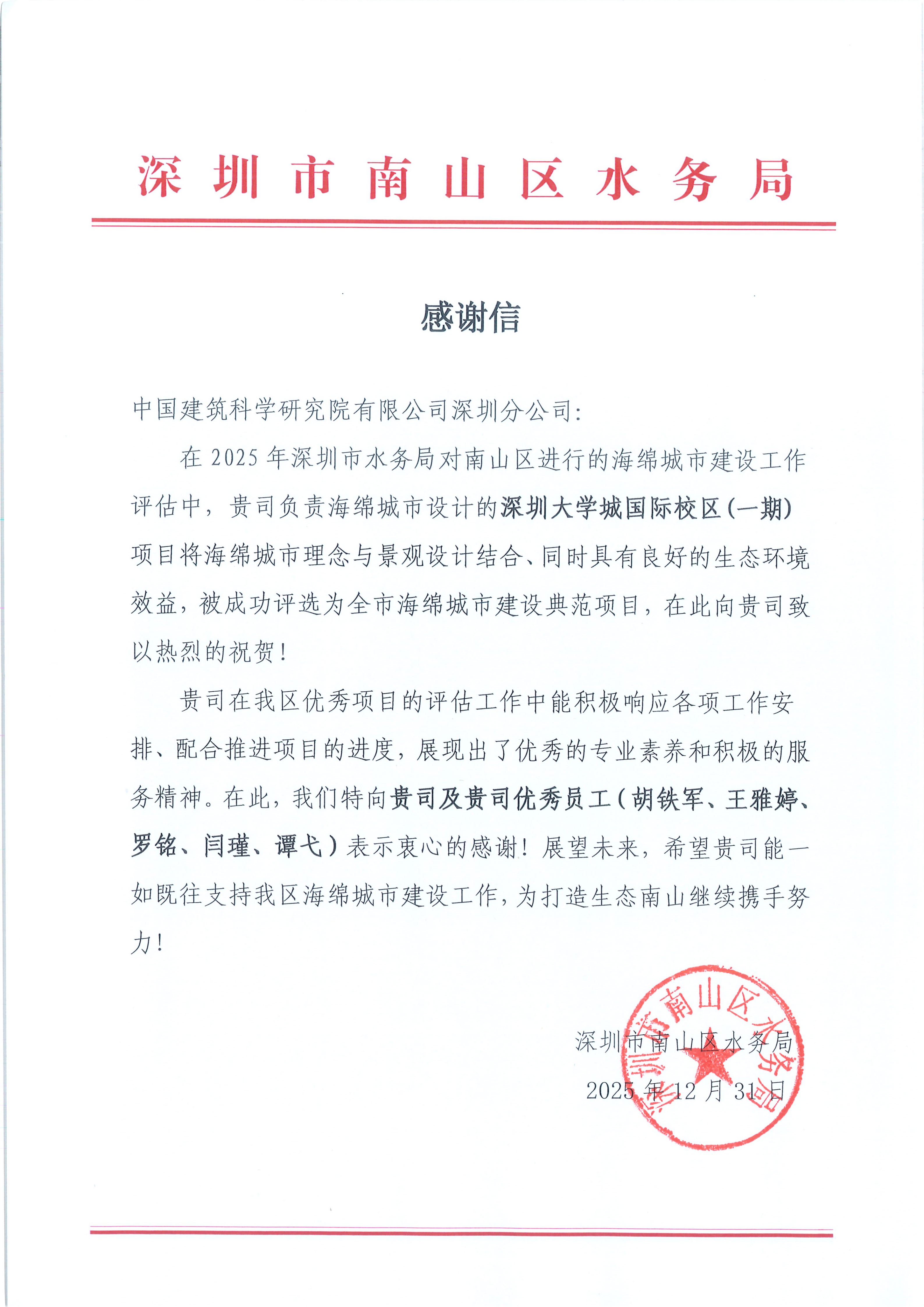 ?深圳市南山區水務局發來感謝信,信中提到中國建研究院深圳分公司負責海綿城市設計的深圳大學城國際校區(一期)項目將海綿城市理念與景觀設計巧妙融合,兼具良好生態效益,成功獲評深圳市海綿城市建設典范項目。此外,特別肯定胡鐵軍、王雅婷等同志的專業付出,期待未來繼續為打造生態南山攜手努力。