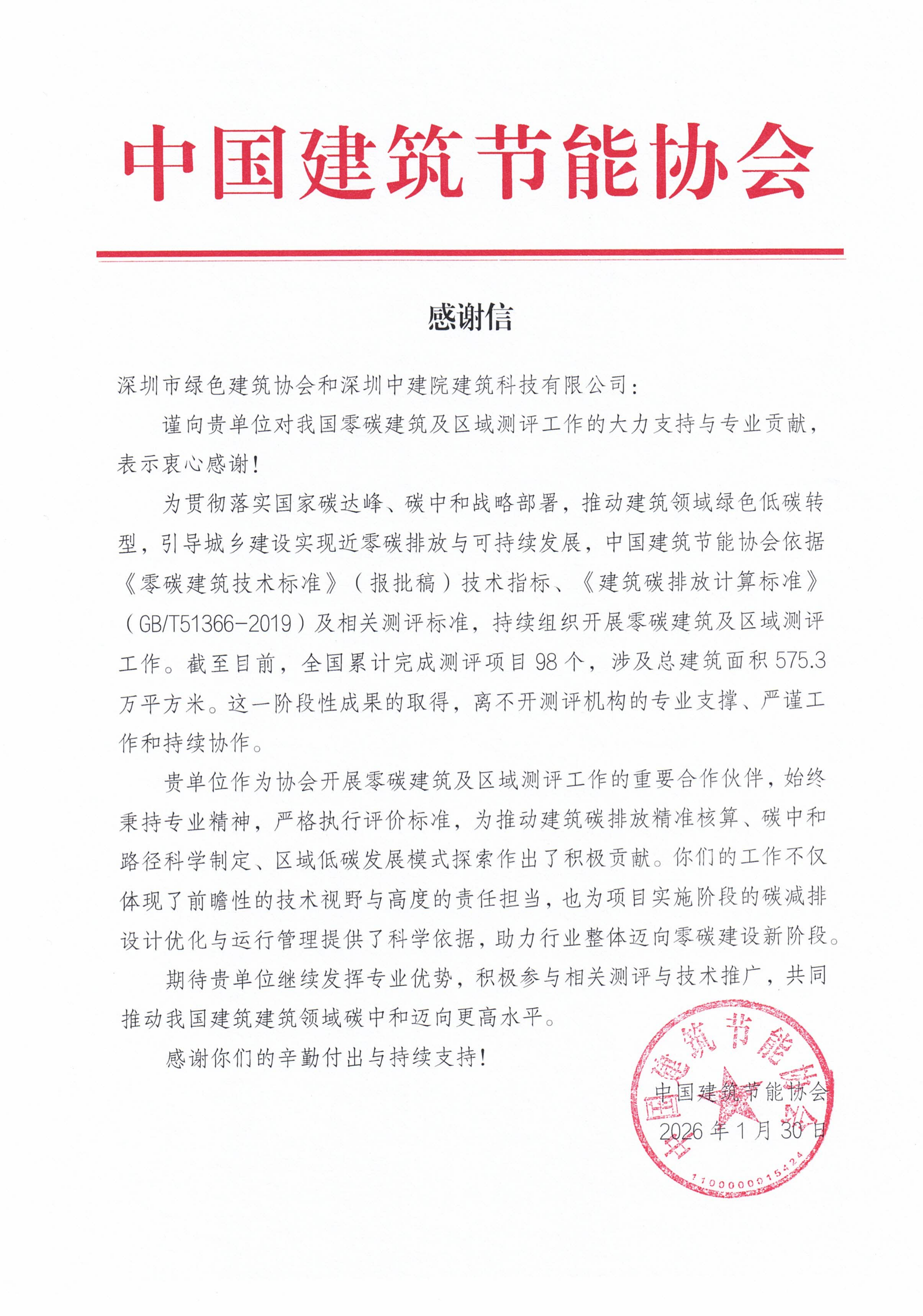 ?中國建筑節能協會發來感謝信,信中提及,為貫徹落實國家“雙碳”戰略部署,協會持續組織開展零碳建筑及區域測評工作。中國建研院深圳分公司下屬深圳中建院作為零碳建筑及區域測評工作的重要合作伙伴,嚴格執行評價標準,憑借專業技術和高度責任擔當,為推動建筑碳排放精準核算、碳中和路徑科學制定、區域低碳發展模式探索做出了積極貢獻,助力行業整體邁向零碳建設新階段。